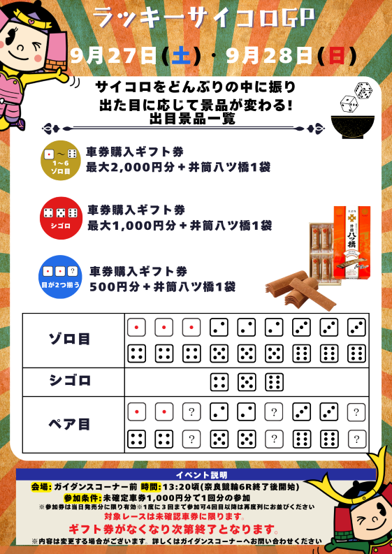 出た目に応じて景品が増える!! 車券購入ギフト券やご当地銘菓「井筒 八つ橋」が当たる!